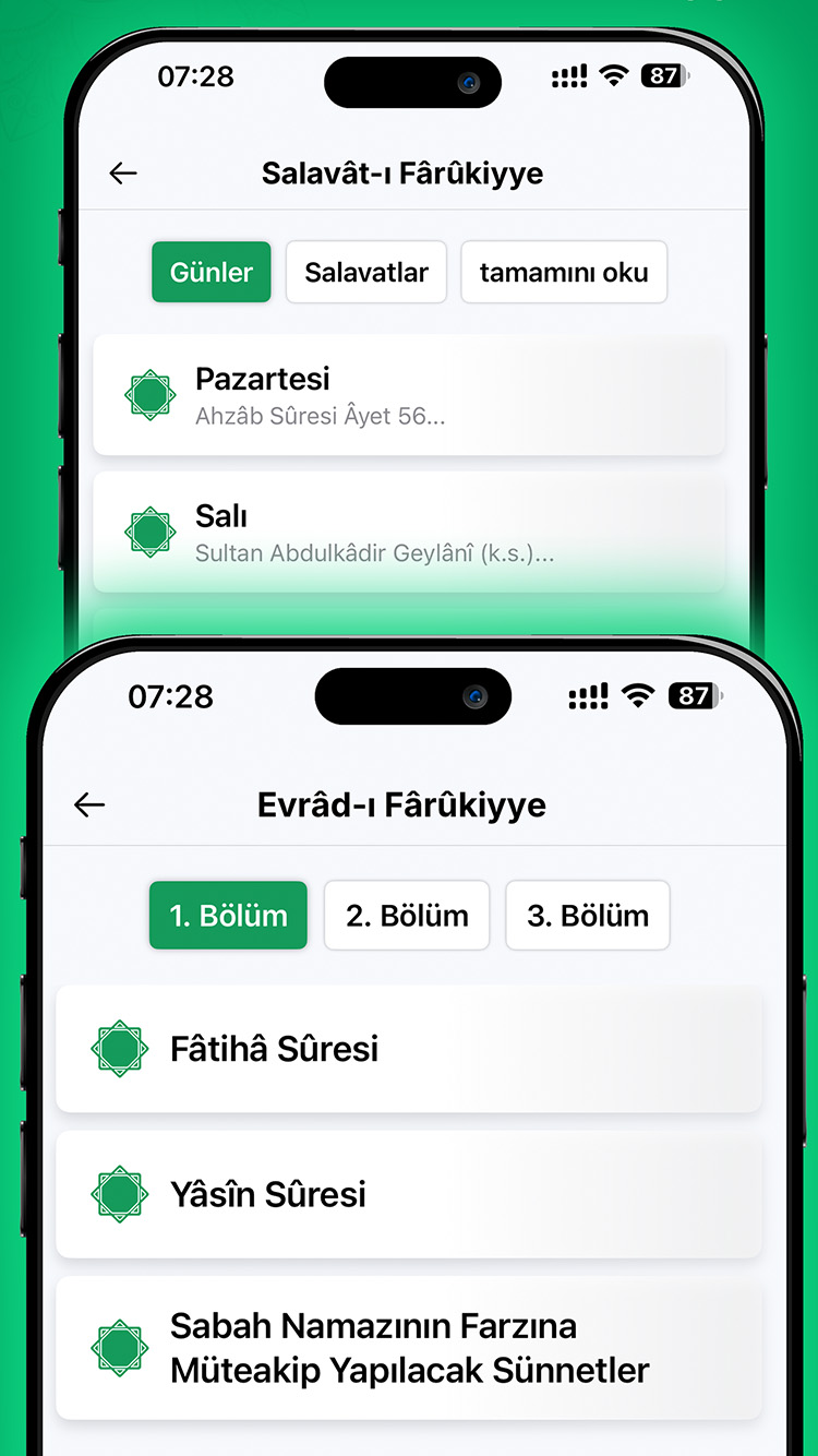 Günlük virdinizi bölümler halinde takip edin, ses eşliğinde Evrâd-ı Fârûkiyye'yi okuyun.