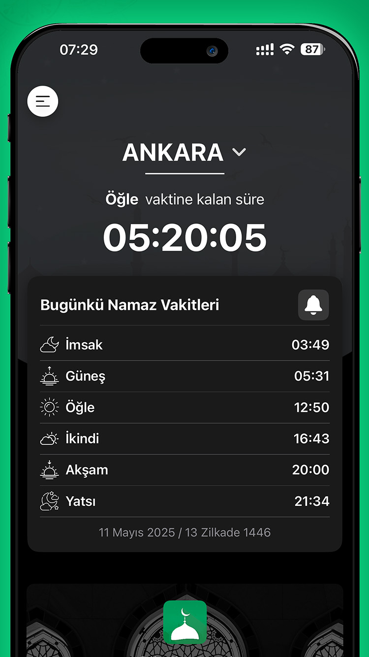 Namaz vakitleri için özelleştirilebilir hatırlatıcılar sayesinde hiçbir vakti kaçırmayın. İsterseniz ezan sesi veya titreşim ile namaz vakitlerinden haberdar olun.